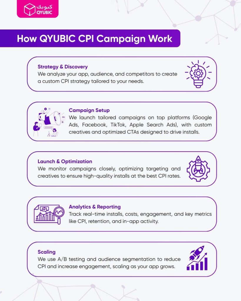At QYUBIC, we don’t just drive installs; we ensure they’re from engaged, high-quality users. With our CPI marketing campaigns, you only pay for real app installs from users likely to convert and stay. Our data-driven approach ensures your budget is spent on installs that matter.