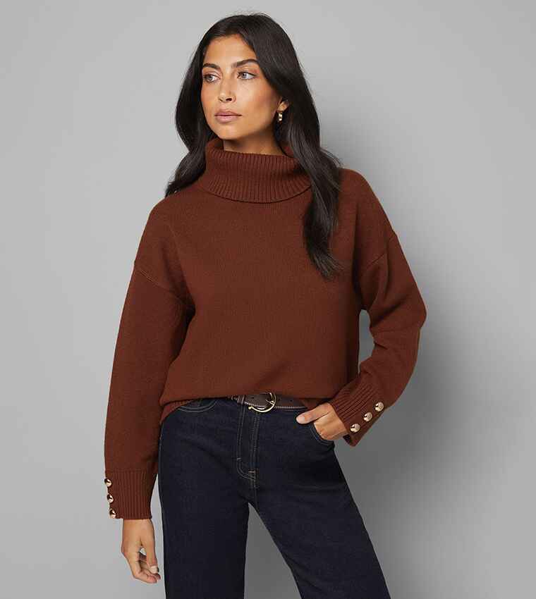 1. Turtleneck Sweater: This Wallis Turtleneck Button Cuff Sweater is perfect for casual winter days. Made from polyester with a touch of acrylic and polyamide, this sweater is warm yet breathable, keeping you comfortable through temperature shifts.