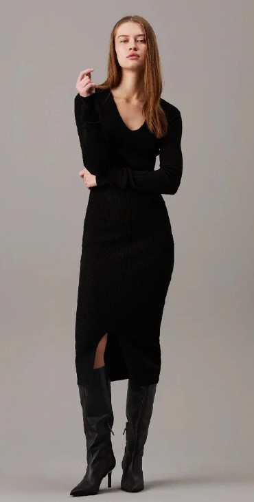 1.Slim Wool Bodycon Dress: Calvin Klein’s Slim Wool Bodycon Dress is perfect for a New Year’s Eve Party. Crafted from merino wool, it offers both elegance and comfort, ideal for a night of dancing and celebrating.